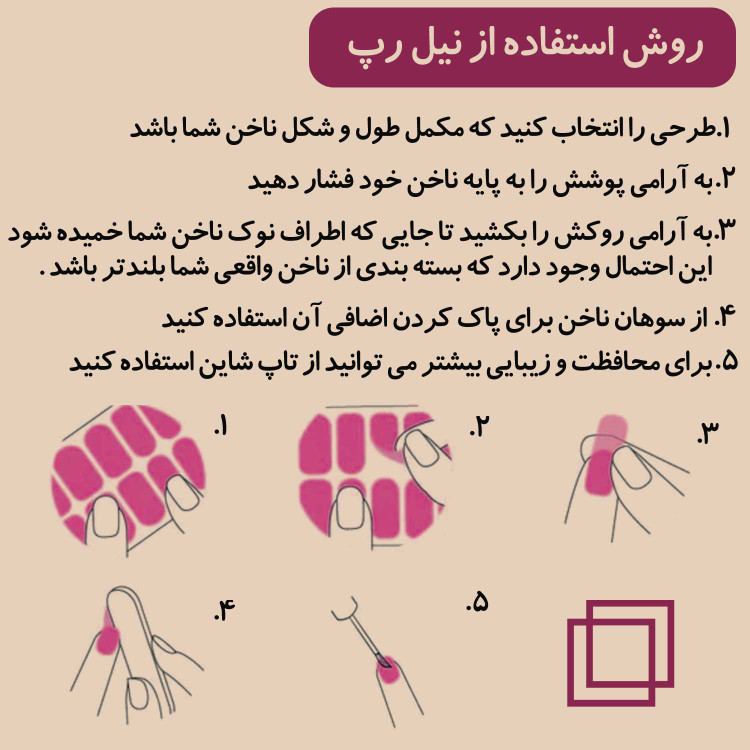 روکش هایی برای ناخن از نوار هایی ظریف که به ناخن شما روح می بخشد. مهمترین ویژگی نیل رپ ها این است که خودشان دارای چسبندگی هستند. بنا بر این فرآیند استفاده بی دردسر و سریع خواهد بود. بدون داشتن لایه ای محافظ از جنس تاپ می توان حداقل یک هفته از داشتن آنها لذت برد و ایده آل برای استفاده های کوتاه مدت مثل تعطیلات آخر هفته خواهند بود . این محصول نسبت به دیگر فرآیند های مانیکور آسیب خیلی کمتری به پوست و ناخن شما وارد خواهد کرد. البته بهتر است برای ماندگاری بیشتر (یک ماه) یک لایه ای محافظ روی آن ها قرار داده شود.