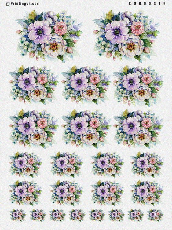 تنوع در اندازه طرحها: در این شیت، طرحهای گل در ابعاد مختلف قرار داده شدهاند تا بتوانید از آنها برای تزیین محصولات مکمل (مانند ست کردن شمع با سینی یا جعبه) استفاده کنید.