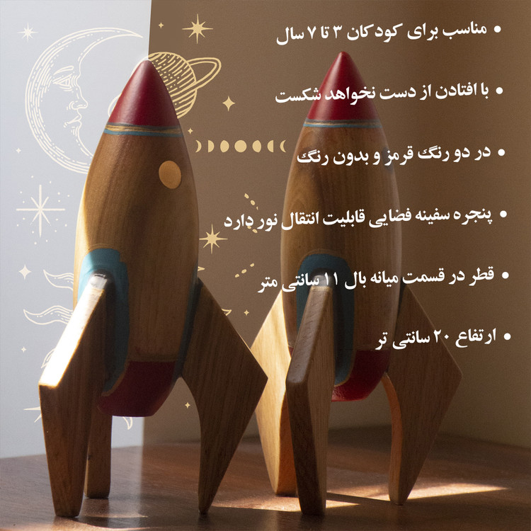 آینده فرزندتان به انتخاب امروز شما وابسته است، موشک چوبی برای کودکانی که آرزوی فضانورد شدند را دارند بهترین هدیه خواهد بود . این محصول چوبی دست ساز است و با دست بر روی آن نقاشی شده بنابراین همه ی سفینه های فضایی کمی با هم متفاوت خواهند بود.